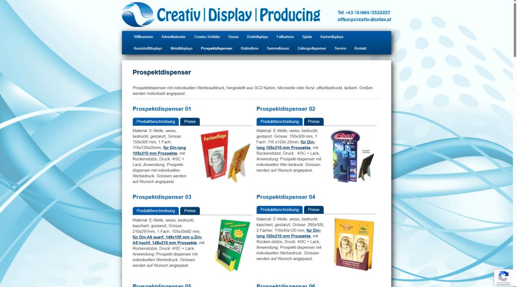Die Produktpalette von Creativ Display Producing ist breit gefächert und auf unterschiedliche Branchenanforderungen ausgerichtet. Zu den typischen Produkten gehören: